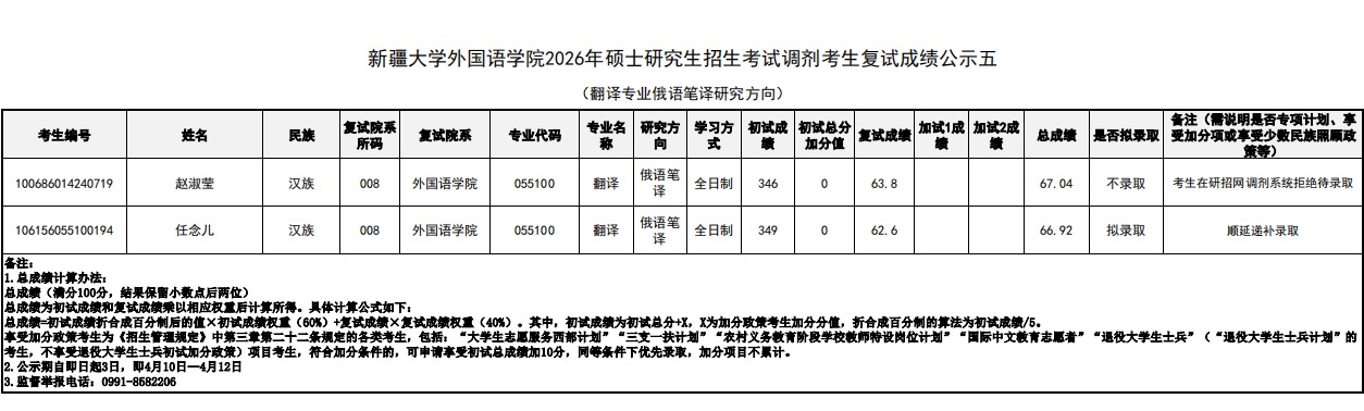 新疆大学外国语学院2026年硕士研究生招生考试调剂考生复试成绩公示五